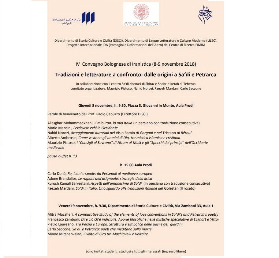 Dipartimento di Storia Culture e Civiltà (DISCI), Dipartimento di Lingue Letterature e Culture Moderne (LILEC), Progetto Internazionale IDA (Immagini e Deformazioni dell’Altro) del Centro di Ricerca FIMIM IV in collaborazione con il centro Sa‘di-shenasi di Shiraz e Shahr-e Ketab di Teheran organizzano la quarte edizione del Convegno Bolognese di Iranistica.